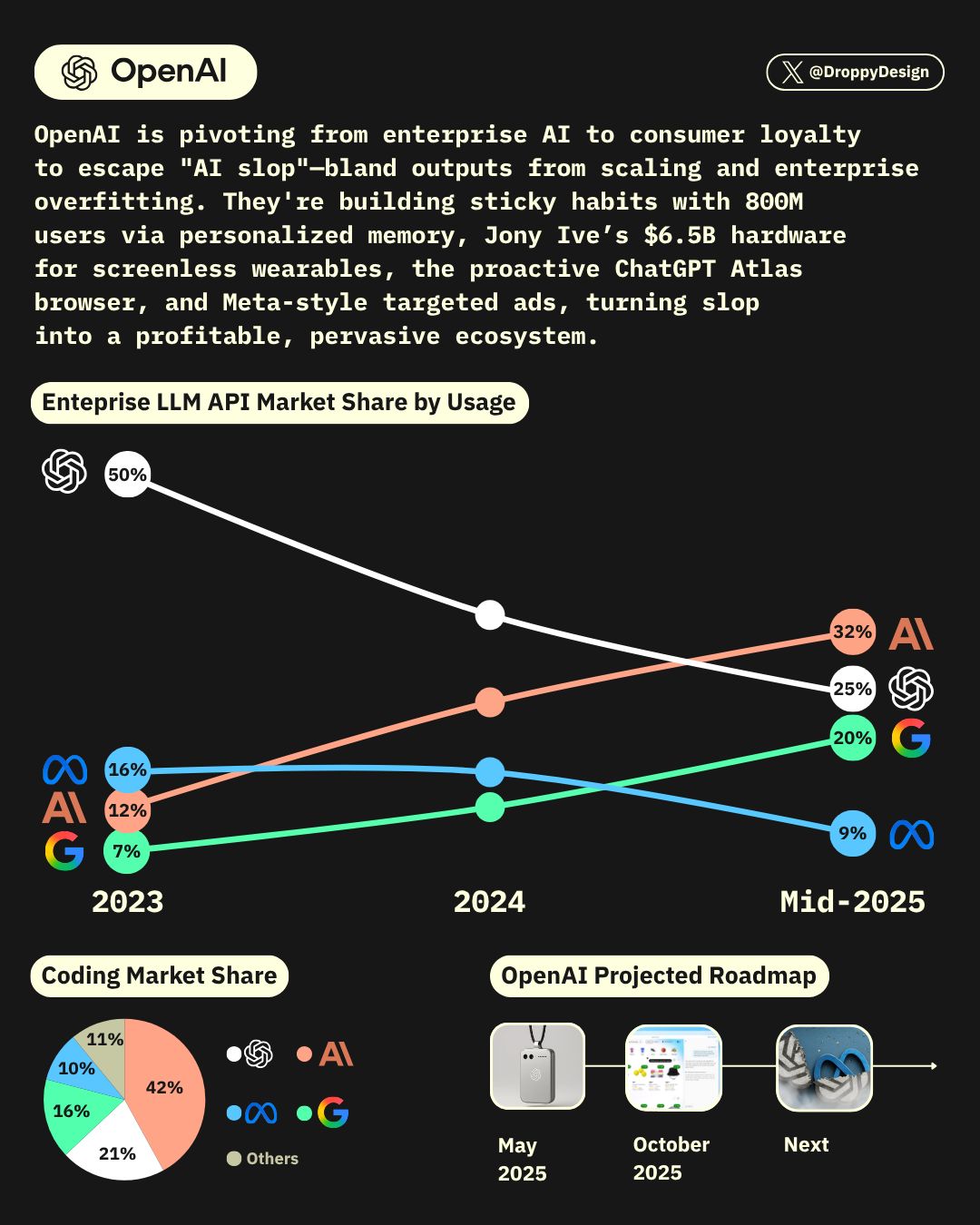 OpenAI’s first-mover advantage, consumer loyalty, hardware integration, proactive browser, and ad strategy position it as the next Meta for the AI era. By prioritizing sticky user habits over enterprise struggles, OpenAI transforms slop into a strength, building an AI ecosystem that’s both pervasive and personal.